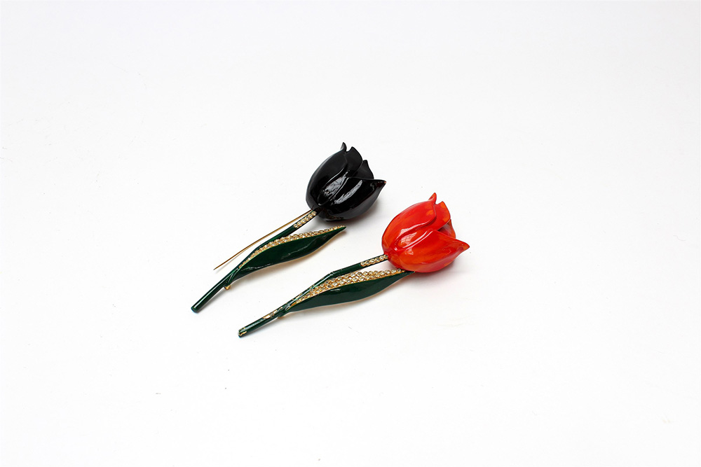 Lotto di due spille a guisa di tulipano in metallo color oro, strass e smalti, confezione Valentino Night (difetti, segni d'uso)