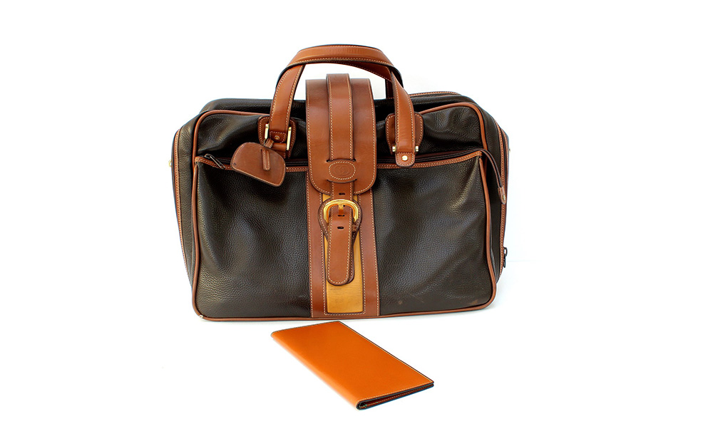 Lot comprising a bi-coloured leather travel bag with plasticized, logoed interior lining and a pouch (cm 52) (defects)