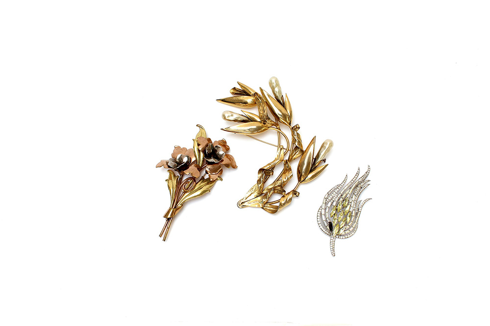 Lotto di tre spille di soggetto floreale in metallo di vari colori decorate con perle fancy e strass, di cui una con fiori en tremblant (cm max 12) (mancanze)