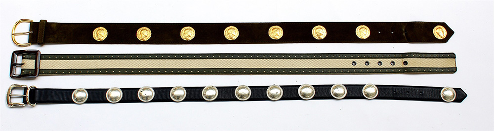 Lotto di tre cinture di forme, materiali e colori differenti due rifinite con dettagli in metallo (difetti)