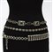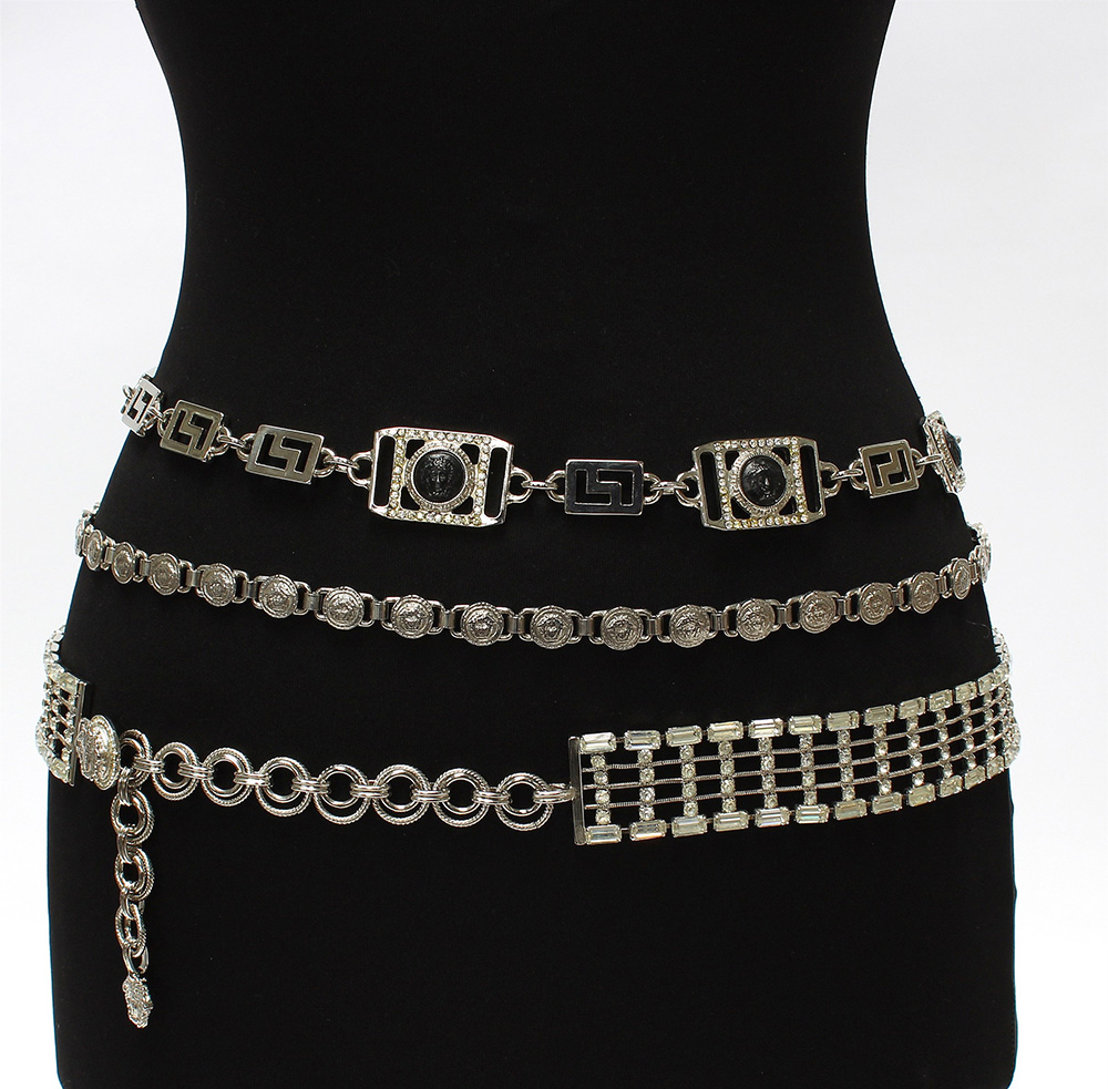 Lotto di tre cinture, di forme e dimensioni differenti, tutte in metallo color nichel, due rifinite in strass (segni d'uso)