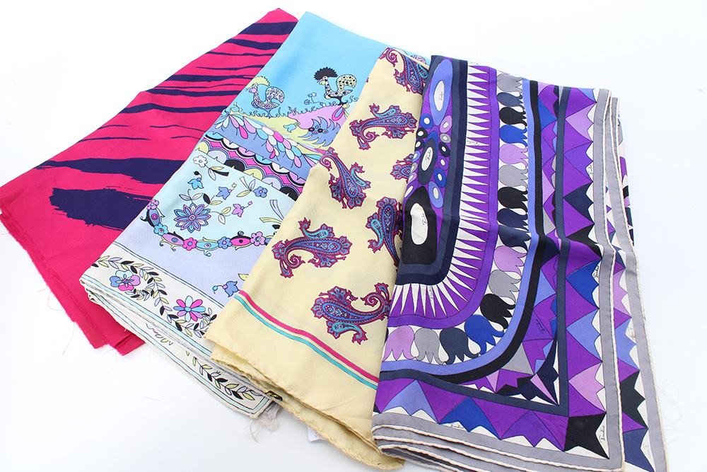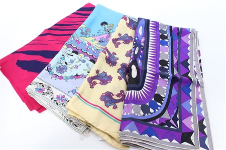 EMILIO PUCCI, BALENCIAGA e anonimoLotto di quattro foulards in seta di vari...