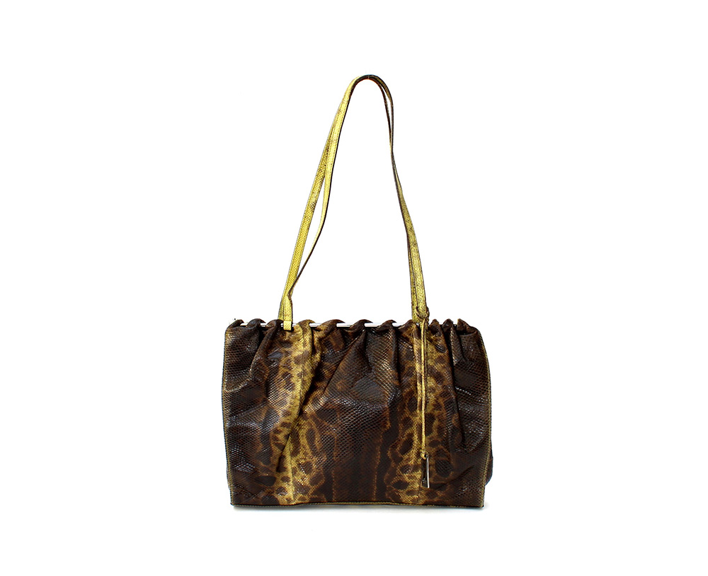 Borsa morbida a soffietto con doppio manico, stampa rettile nei toni del verde oliva e marrone, dustbag (cm 28)