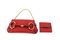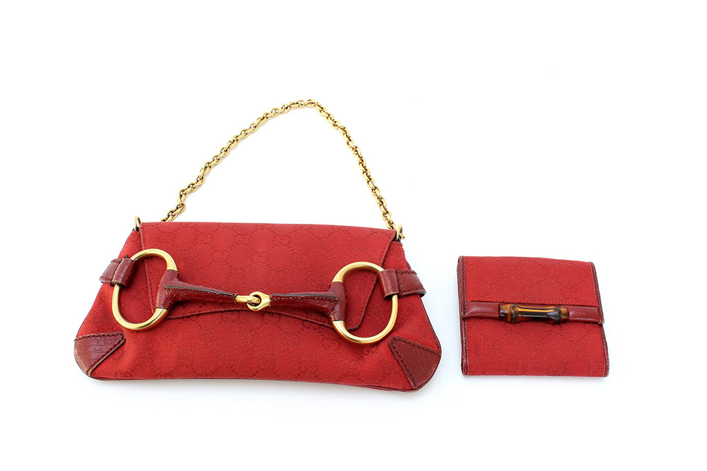 Lotto composto da piccola borsa a tracolla in tela logata color rosso con motivo di grande morso di cavalo color ottone opaco unito a un portafoglio nella stessa tela e colore con chiusura di bambù, con dustbag (cm 27 e 10) (difetti e segni d'uso)