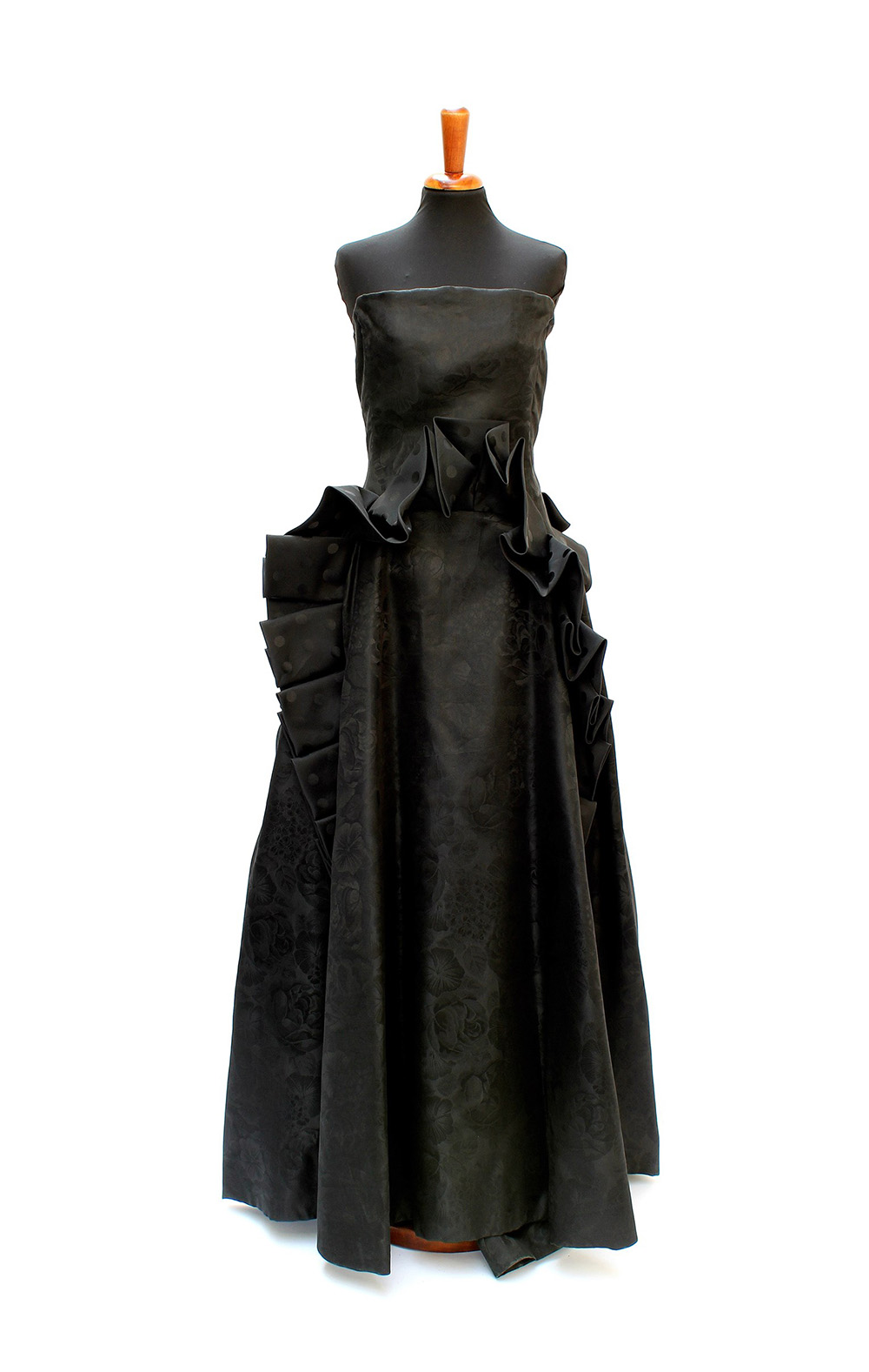 Vestito lungo in seta damascata con applicazione di ruches a pois (tg. 42)