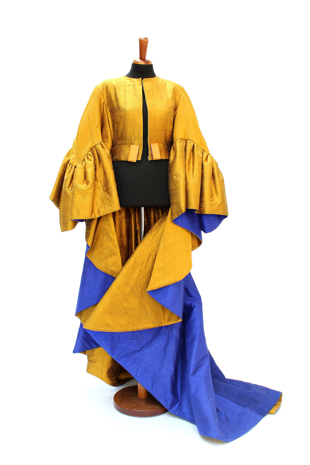A very rich and important shantung ruffled cloack in gold and bright blue (tg. 44/46) (defects, wear)