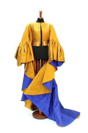 Importante "cappa" con corpino e strascico arricchito da ruches in color oro e blu elettrico (tg. 44/46) (difetti e segni d'uso)