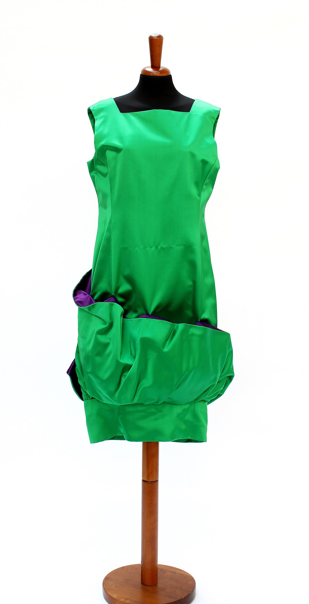 A calf-length purple and emerald green satin dress with a corolla motif around the hem (tg. 42) (minor signs of wear)