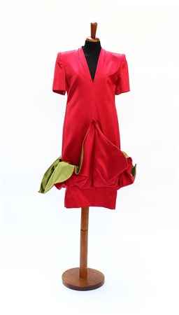 Vestito longuette in raso di seta rosso e verde acido con applicazione a "corolla" (tg. 42) (lievi segni d'uso)