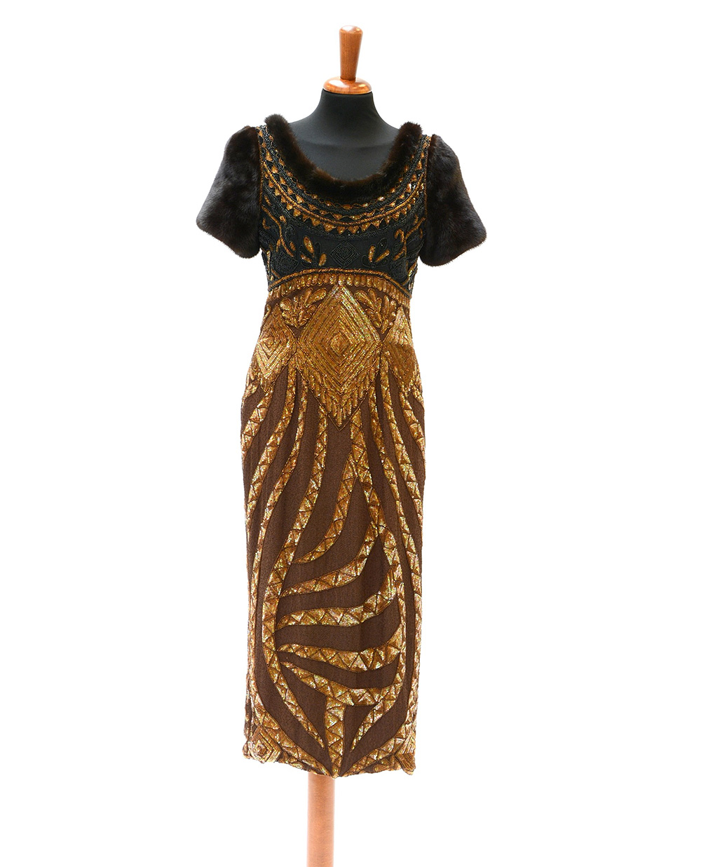 Abito longuette interamente ricamato con swarovski nei toni del ruggine, nero e argento su fondo nero con maniche e scollo bordato in visone (tg. 42)