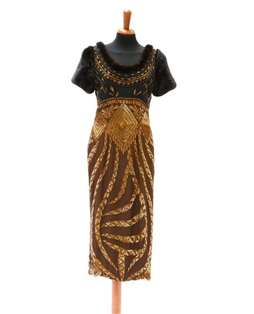 A calf-length dress entirely embroidered with rhinestones and sequins in the shades of brown, rust and yellow on black ground, short sleeves and neckline in mink (tg. 42)