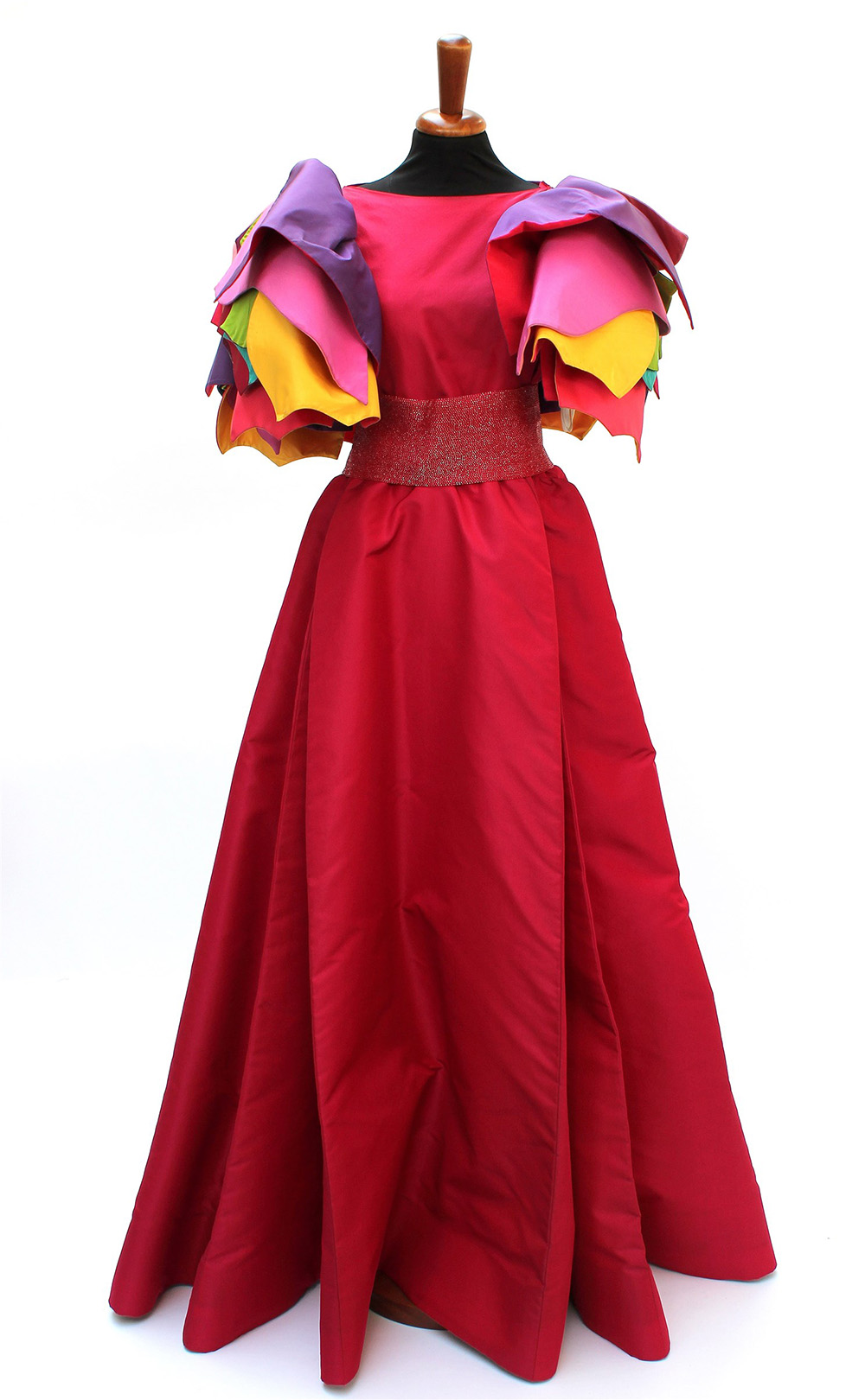 A fuschia faille long dress with multicoloured layered sleeves and embroidered belt (tg. 42) (minor signs of wear)