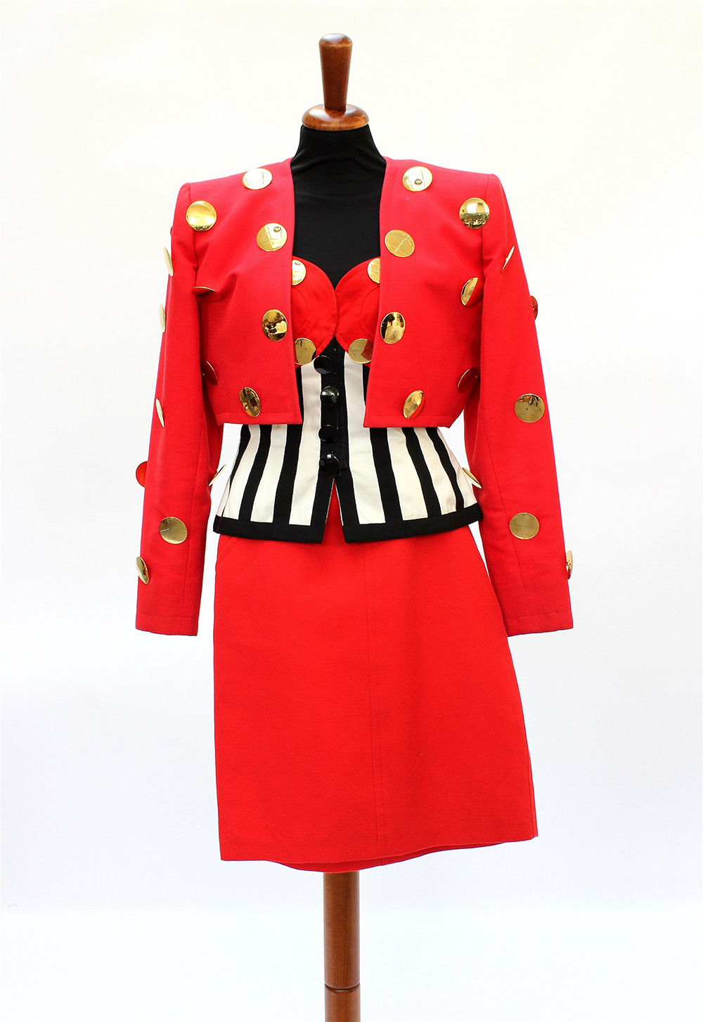 Lot comprising a bolero, a top and a skirt in white, red and black cotton, gilt-metal details (tg. 40/42) (minor signs of wear)