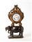 Orologio da carrozza in ottone con tracce di lacca, inserito in una cornice porta orologio intagliata e dorata supportata da elefante in legno