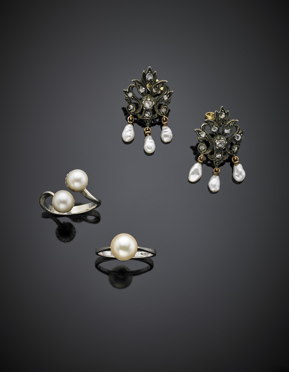 Lotto composto da due anelli in oro bianco con perle, dei quali uno contrarie ed un paio di orecchini in oro giallo, argento, diamanti mezza rosetta e perle, complessivi g 13,40.