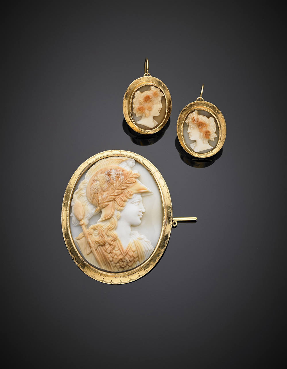 Demi-parure composta da spilla e orecchini con attacco all'antica in oro giallo e cammei in conchiglia con testa di guerriero e profili femminili, complessivi g 31,40.