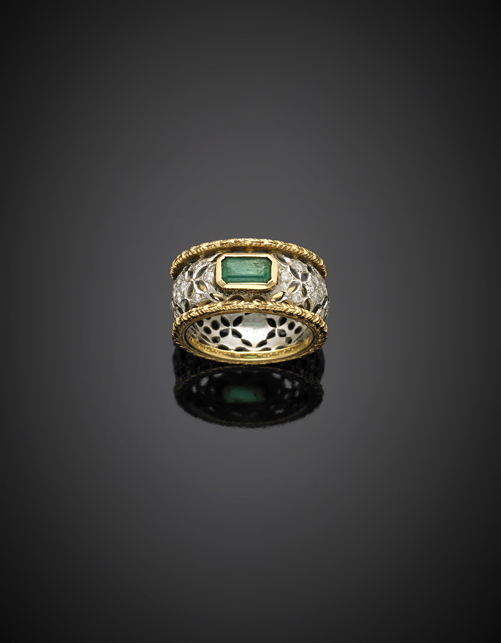 Octagonal emerald and diamond openwork bi-coloured gold band ring in Buccellati style, g 7.88 size 13/53.