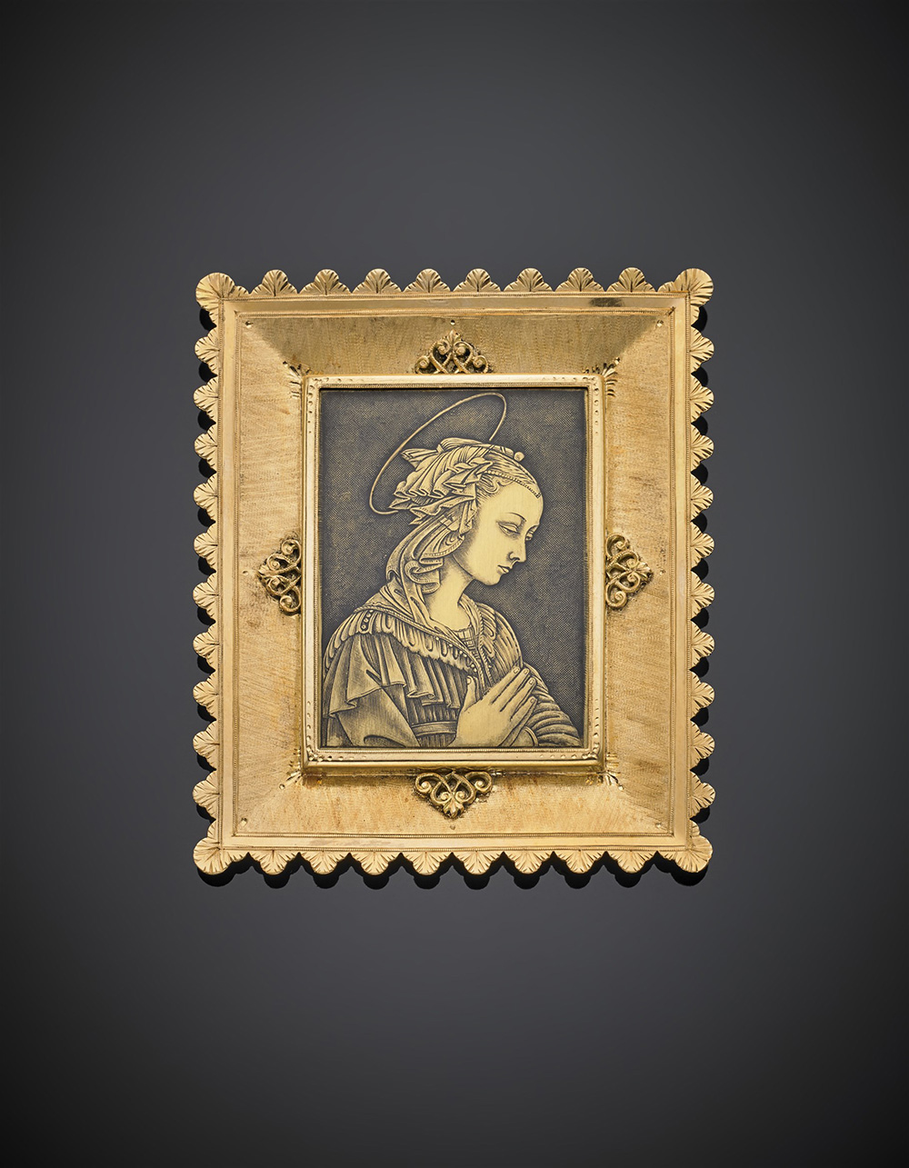 Yellow chiselled gold decorative object with Virgin Mary, with frame and glass, gross g 66.22, length cm 7.90, width cm 6.60 circa. In original case