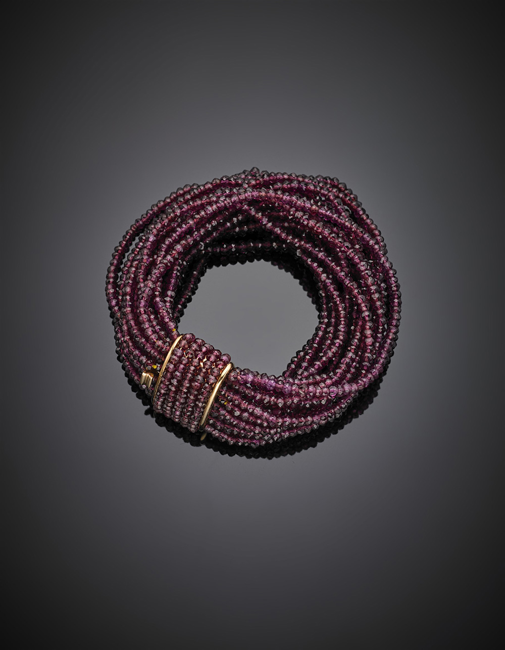 Bracciale multifilo con granati sfaccettati e chiusura in oro giallo, g 94,23, lungh. cm 19 circa.
