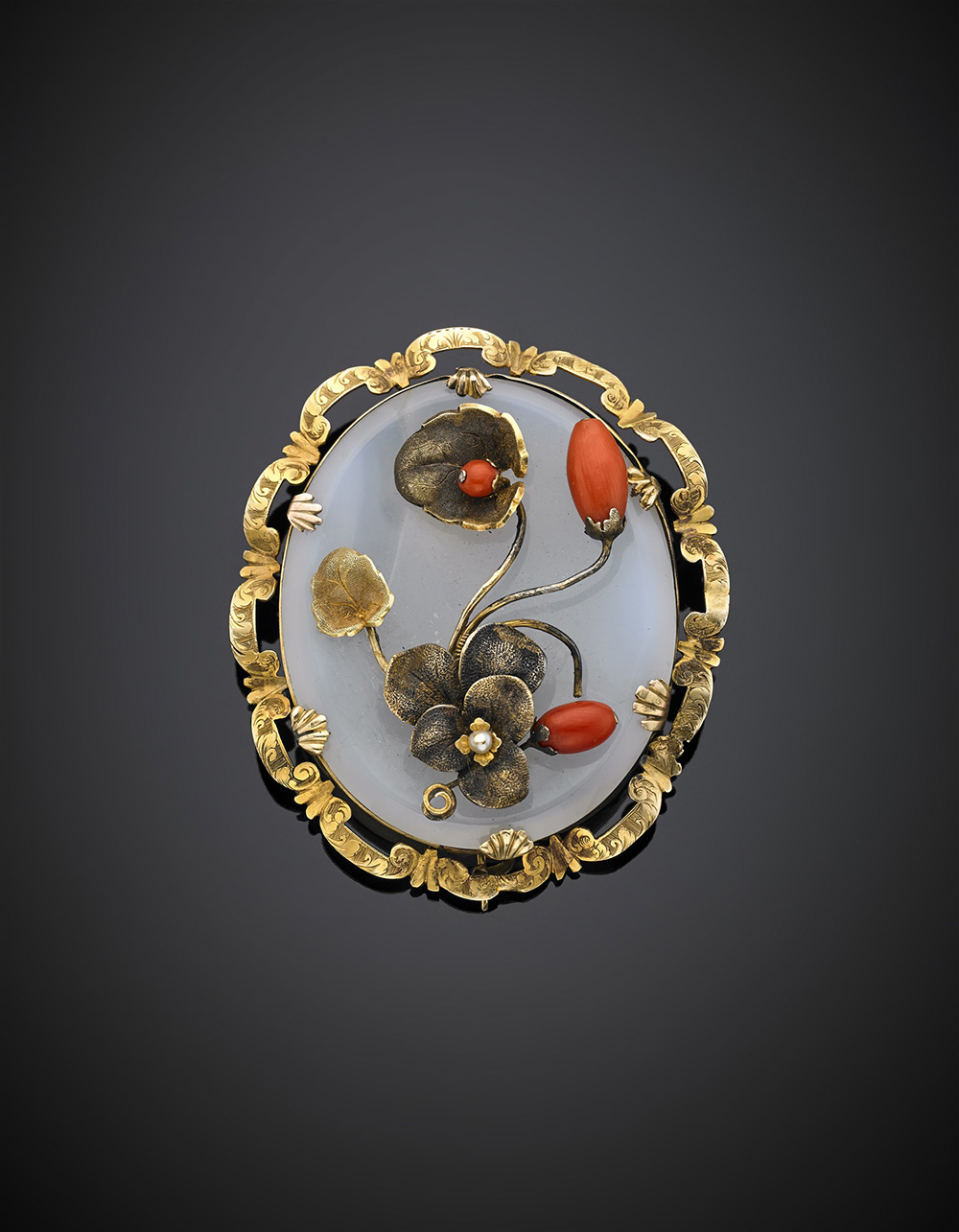 Broche in oro giallo 585/1000 rifinita con coralli e microperle su agata...