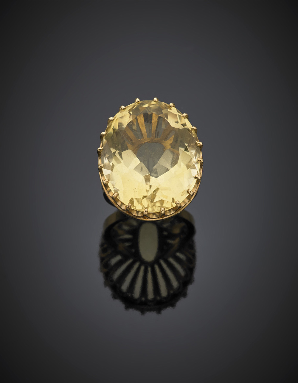 Anello in oro giallo con quarzo citrino ovale taglio composito di ct. 41 circa, g 19,73 misura 10/50.