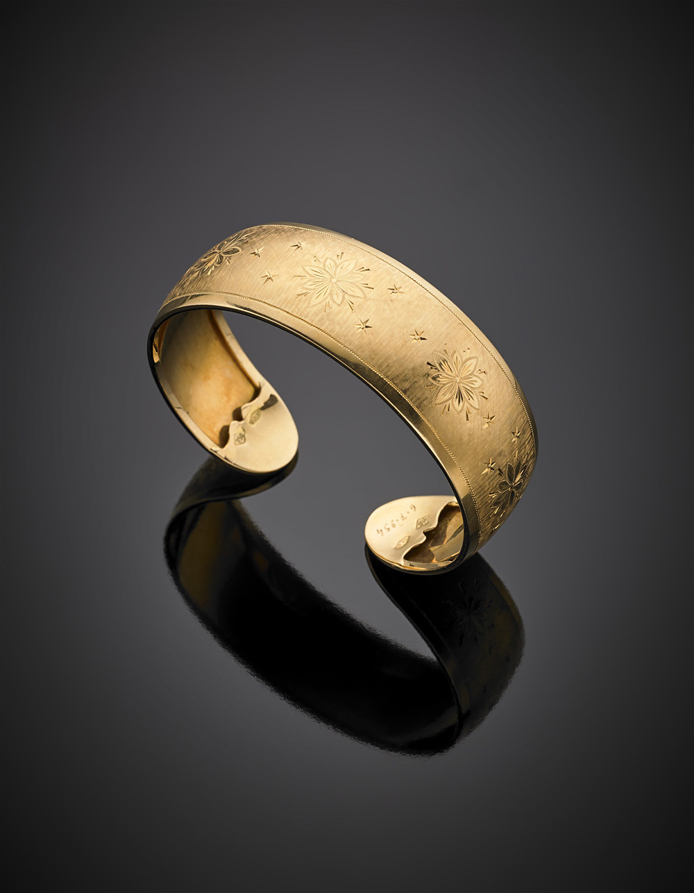 Bracciale rigido alla schiava in oro giallo, lucido, satinato e cesellato, g 30,92, diam. cm 6,90.