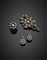 Demi-parure composta da broche, anello e orecchini in oro e argento rifinito con diamanti a mezza rosetta, complessivi g 27,50. In custodia originale