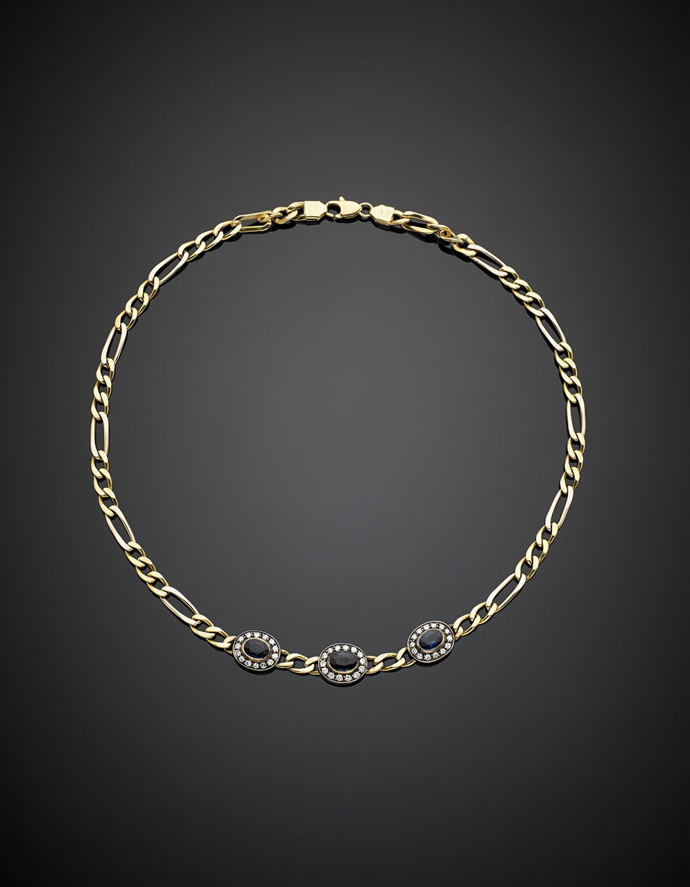 Collier in oro giallo e bianco con al centro tre zaffiri ovali taglio composito contornati da diamanti rotondi taglio a brillante moderno europeo, g 32,19, lungh. cm 45 circa.