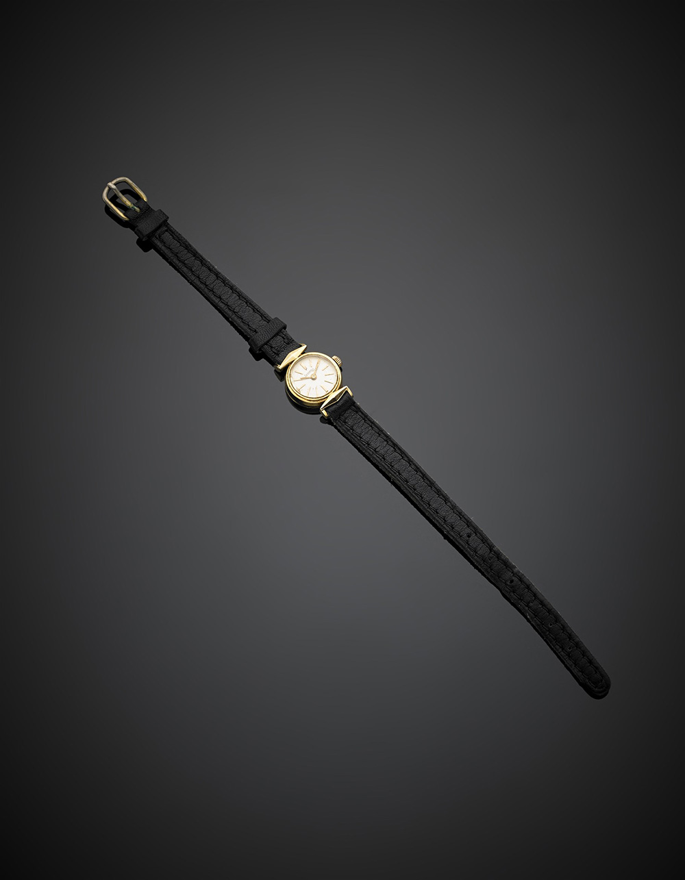 Lady's yellow gold wristwatch, case n.63 186, black leather strap, gross g 9.14, length cm 18.10 circa.
