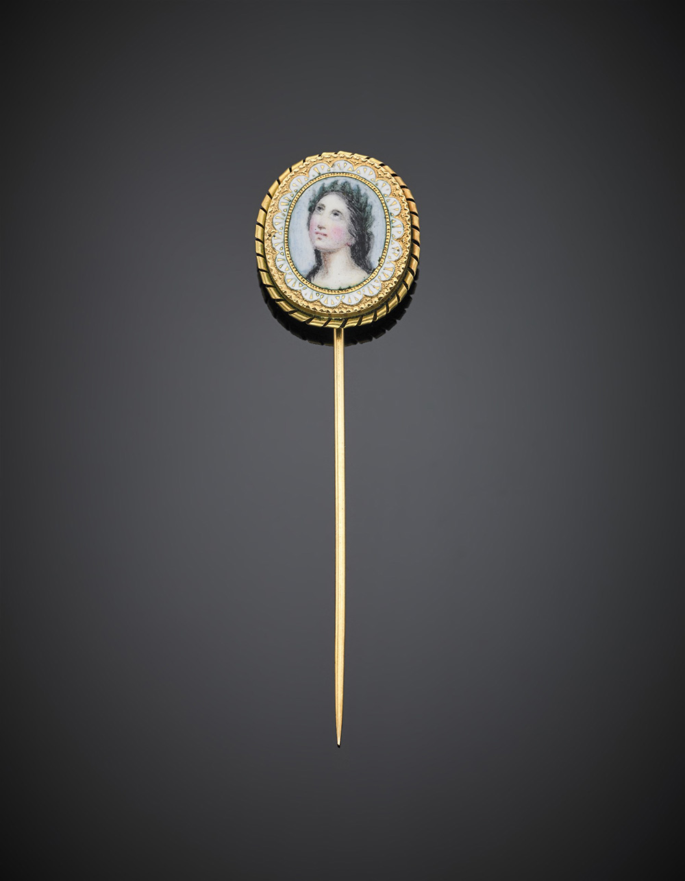 Spillone in oro giallo con miniatura a viso di donna, g 5,04, lungh. cm 7,50, diam. cm 2 circa.