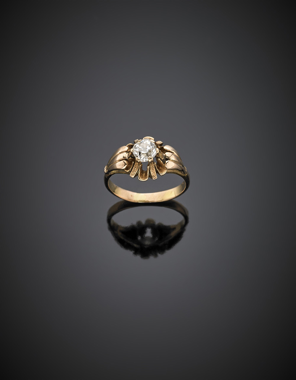 Lot 758 | Anello in oro rosso con diamante a cuscino di ct. 0,45 circa taglio old mine,...