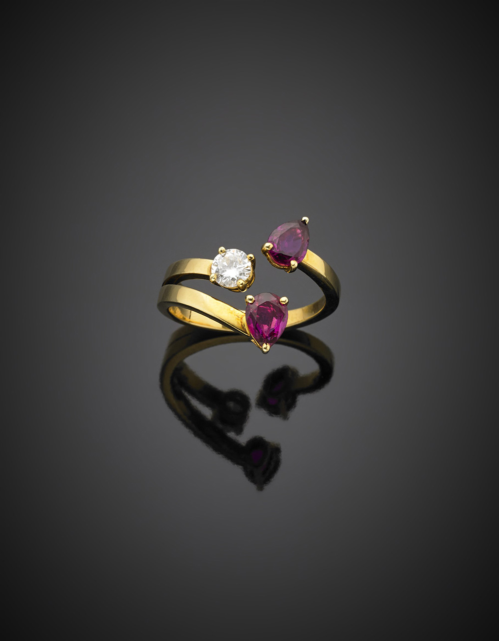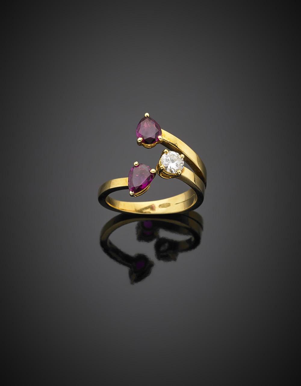 Round ct. 0.50 circa diamond and two pear ruby, in all ct. 1.30 circa yellow gold ring, g 8.47 size 21/61.