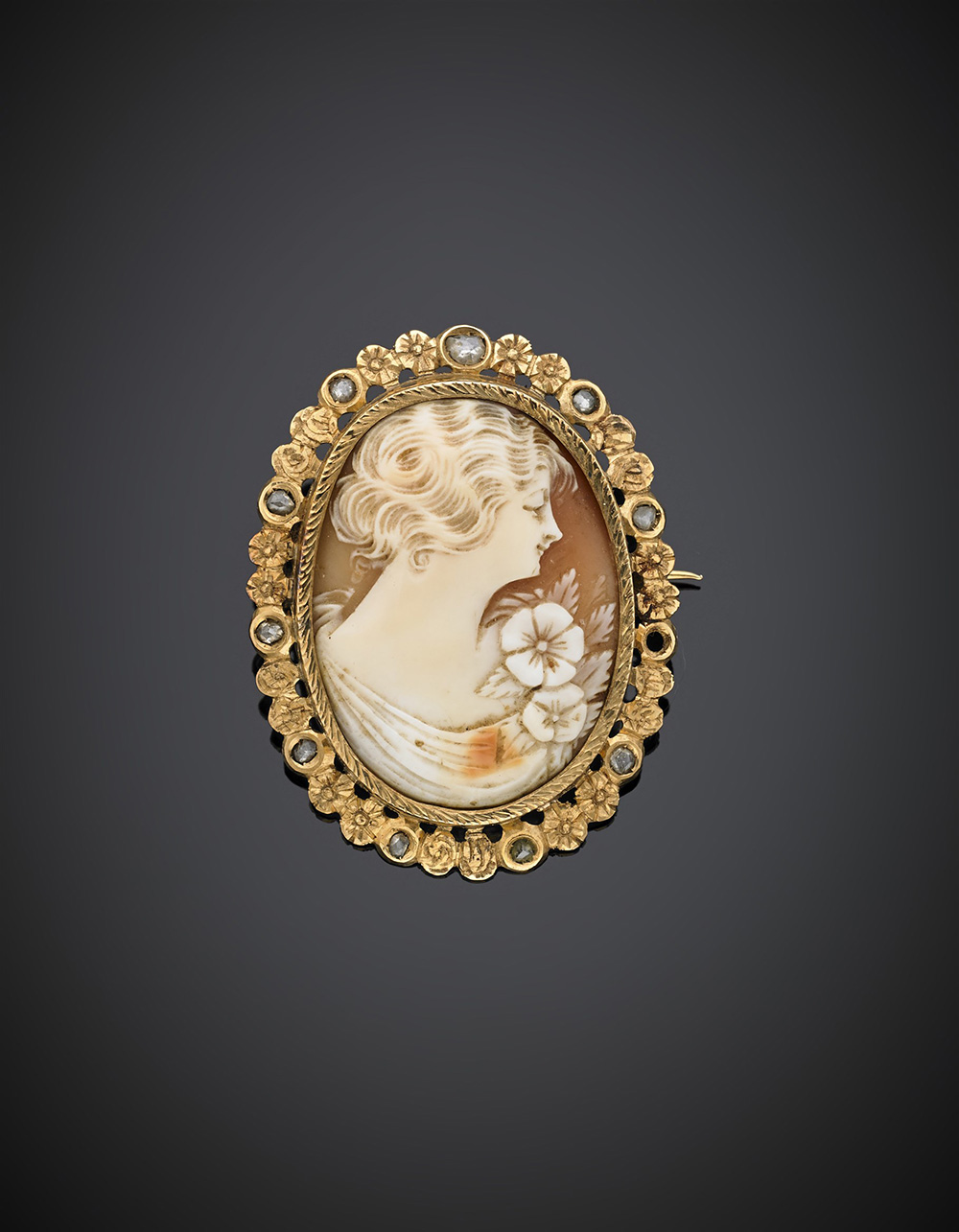 Spilla con cammeo in conchiglia montato in oro giallo lavorato, rifinito con diamanti a mezza rosetta, g 12,15, lungh. cm 4,50, largh. cm 3,50 circa. (mancanze)