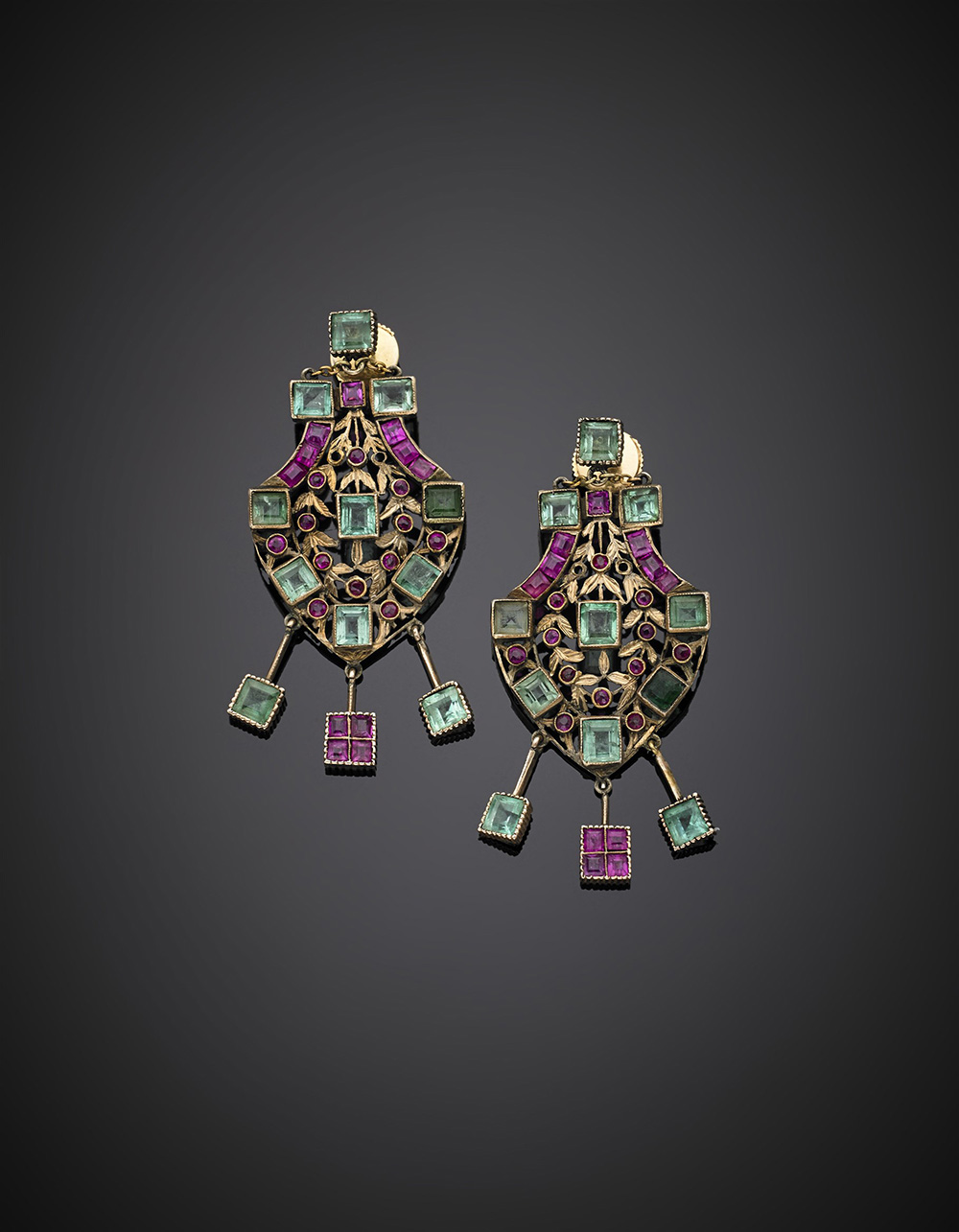 Orecchini in oro rosso 585/1000 con smeraldi rettangolari e rubini rotondi e calibré, a guisa di palmette rovesciate,, lungh. cm 11,34, largh. cm 5,50 circa.