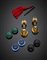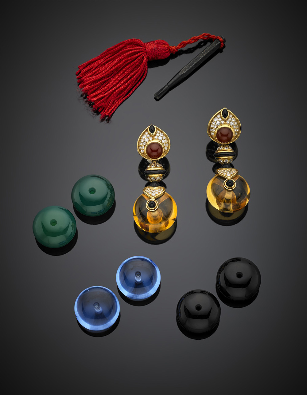 Diamond, onyx and carnelian yellow gold ear pendants suspending two citrine quartz beads with replacements in green chalcedony, onyx and blue quartz, in all g 85.57. Each item in original custody with assembling accessory