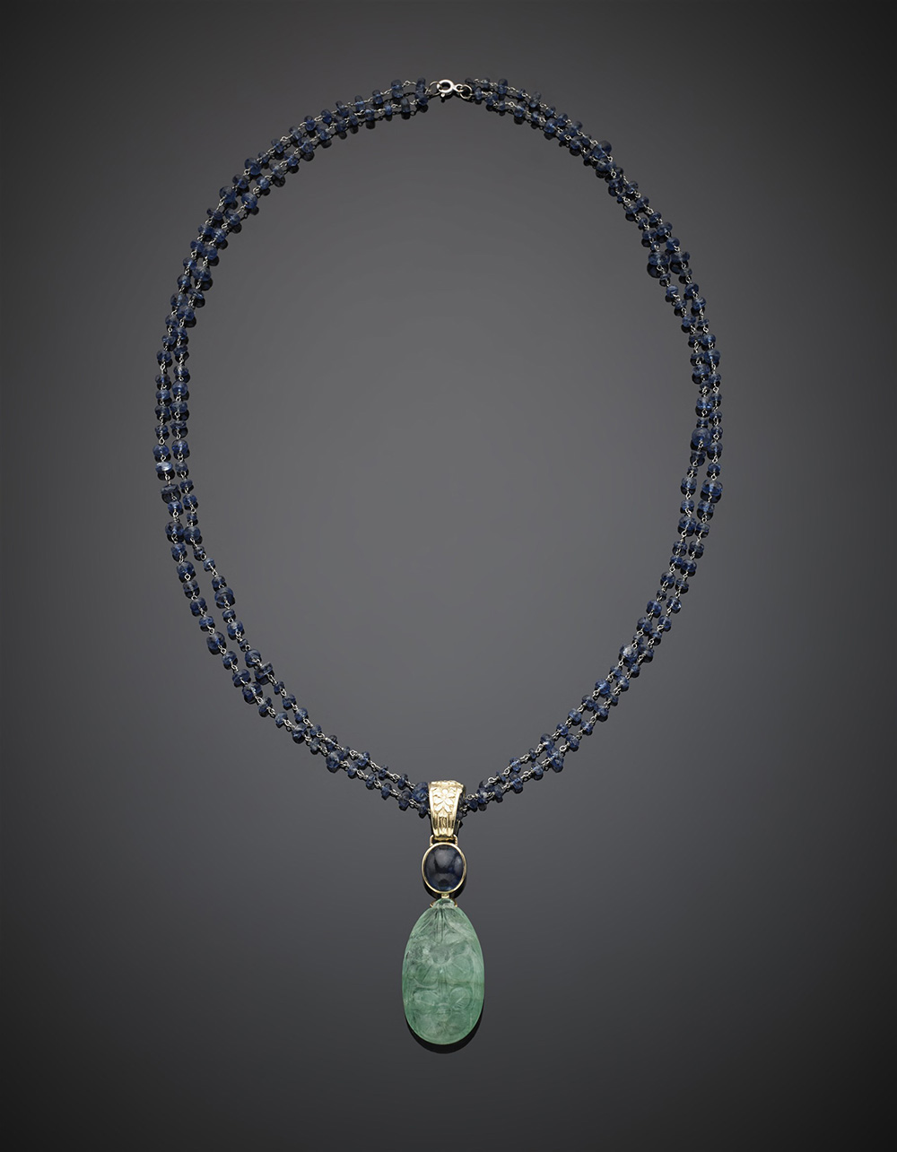 Collier in platino e zaffiri con pendente in oro giallo, zaffiro ovale cabochon e smeraldo a goccia scolpito di ct. 60 circa g 40,17, lungh. cm 68 circa. (difetti)