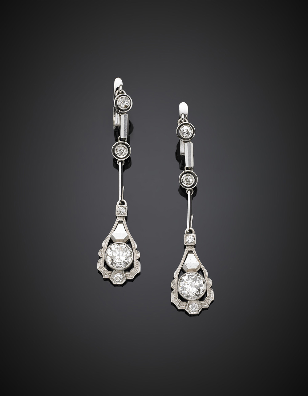 Orecchini pendenti in platino con diamanti, i due terminali da due di ct....