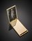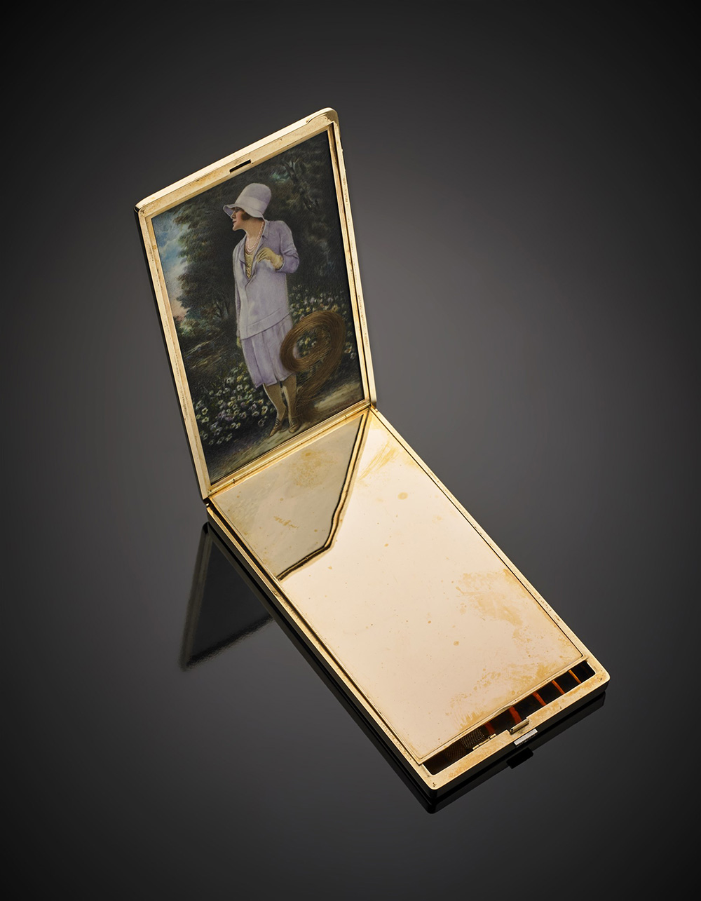 Portasigarette con miniatura dipinta da C.S.Willschek di figura femminile con paesaggio di sfondo tutto in oro giallo con inciso stemma araldico, rifinito in argento e diamanti sulla chiusura e sulle iniziali CG, g 269,56, lungh. cm 15,80, largh. cm 8,70, h cm 1,50 circa. In custodia originale
