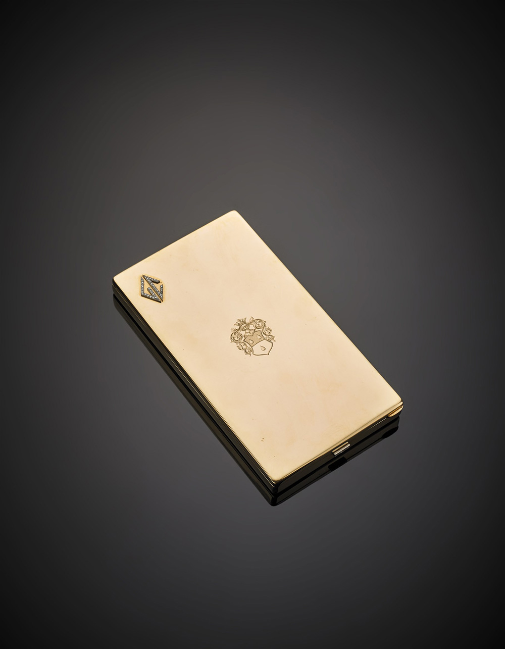 Yellow gold cigarette with chiselled family crest accented with silver and diamond on the clasp and on the CG initials , inside a C.S.Willschek lady in landscape miniature, g 269.56, length cm 15.80, width cm 8.70, h cm 1.50 circa. In original case