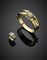 Demi-parure composta da bracciale rigido apribile a fascia in oro bianco e giallo con diamanti rotondi e a baguette, diam. cm 6 circa; ed anello a fascia in oro giallo e bianco con diamanti rotondi a baguette per complessivi ct. 5,05 circa , misura anello 20/60, g 90,55. (mancanze)