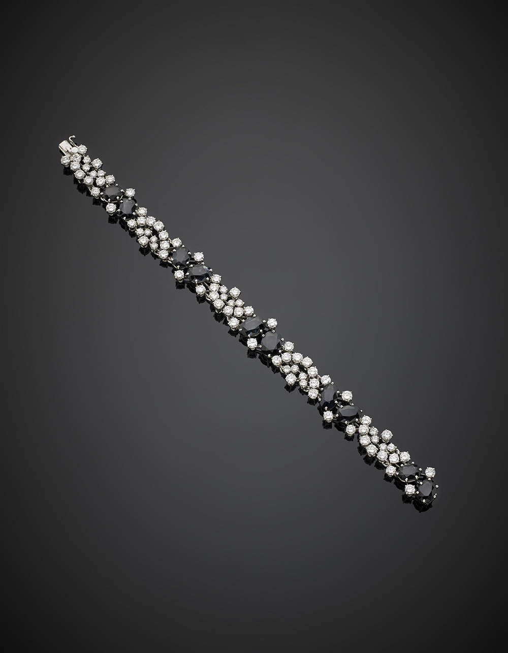 Bracciale in oro bianco con diamanti rotondi taglio a brillante moderno europeo e dieci zaffiri ovali taglio composito, diamanti per complessivi ct. 13,50 circa e zaffiri per complessivi ct. 21,40 circa g. 30,30 g 30,30, lungh. cm 18,90 circa.