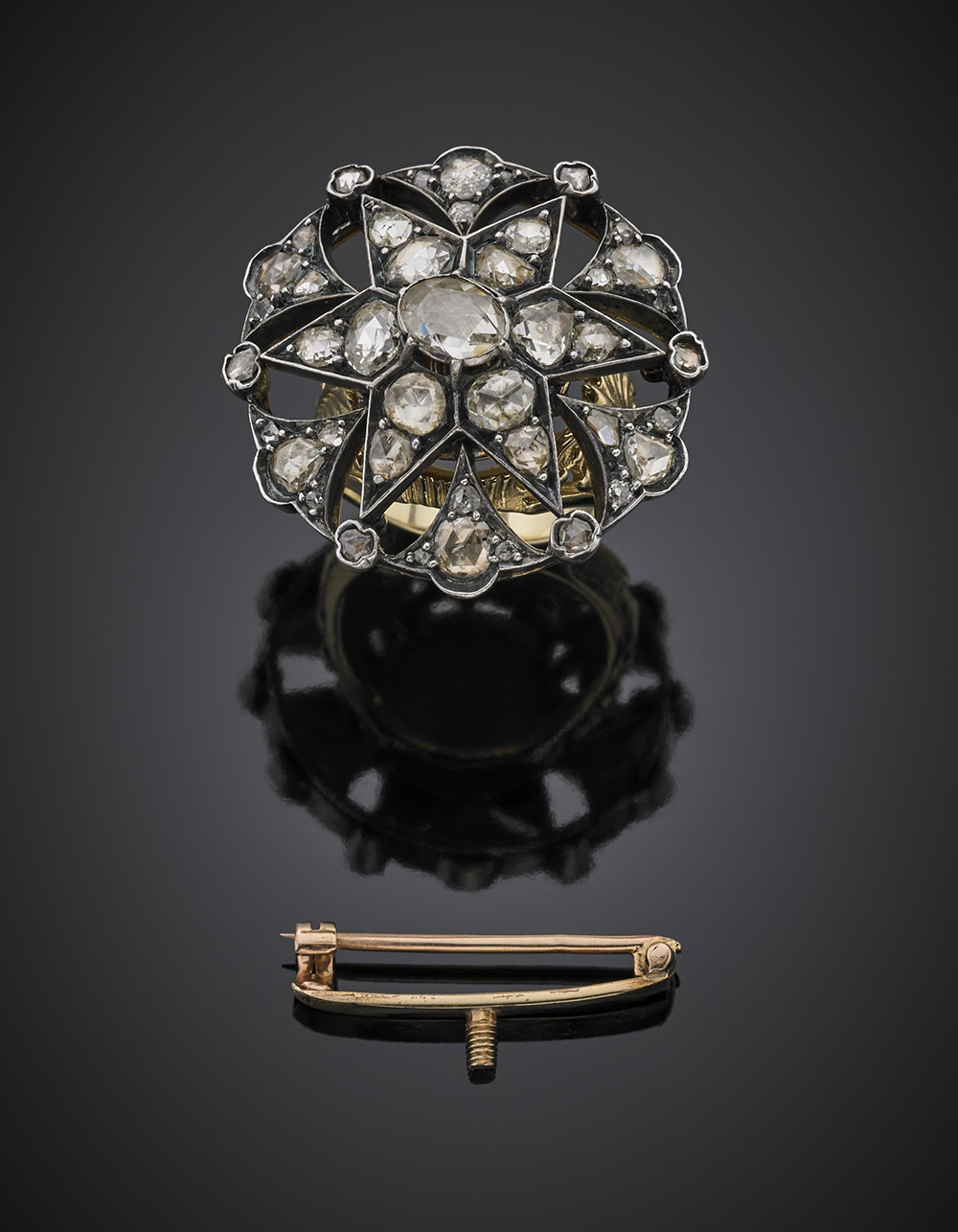 Broche a guisa di stella trasformabile in anello in oro giallo, argento e diamanti taglio mezza rosetta, complessivi g 27,26 misura 17/57.