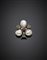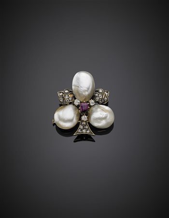 Broche in oro e argento con diamanti irregolari mezza rosetta, al centro un rubino e tre perle naturali di acqua salata a segnare la forma a trifoglio, g 17,55, lungh. cm 3,60 circa.