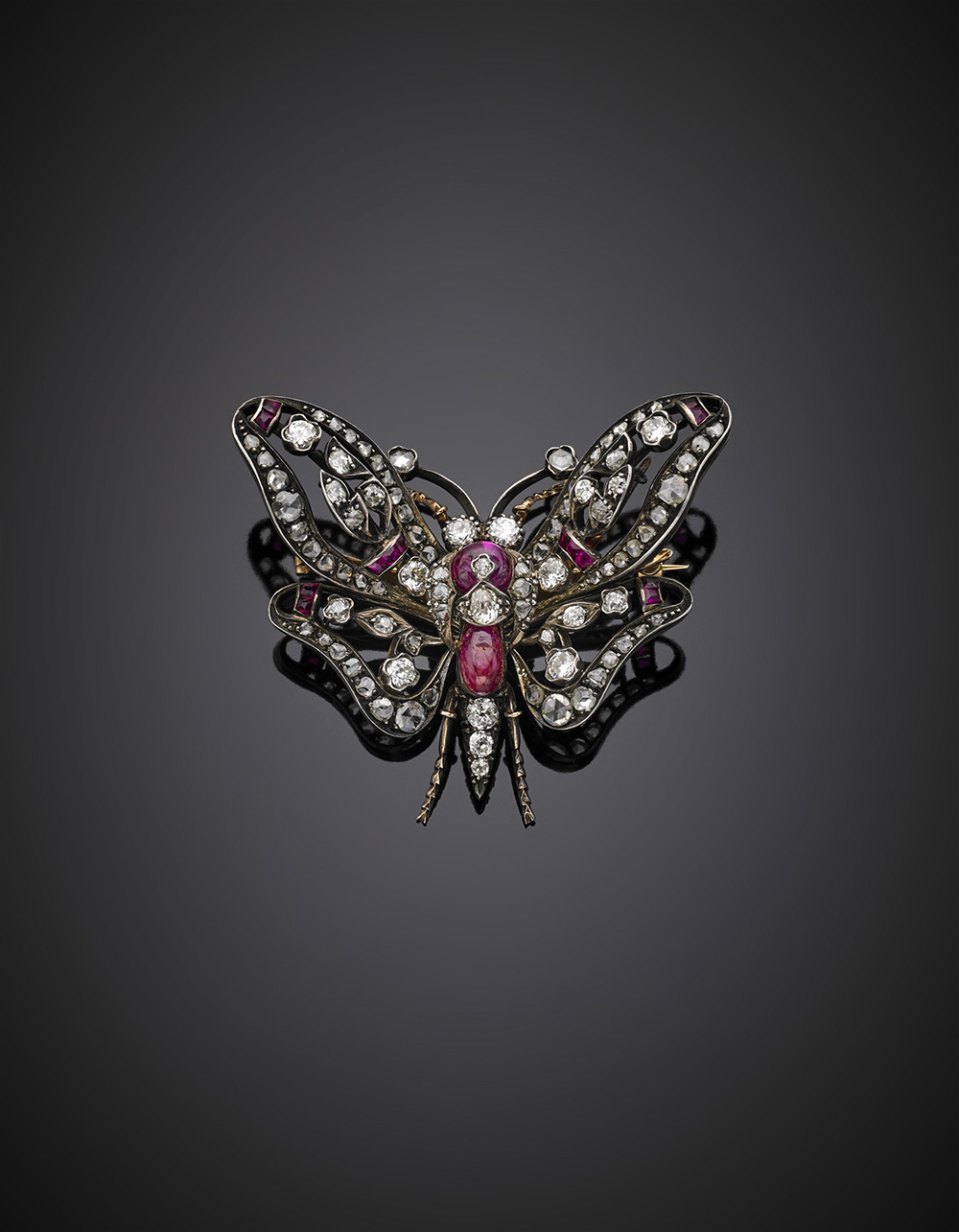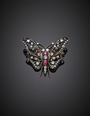 Broche in oro giallo, argento, rubini, diamanti rotondi e a mezza rosetta a guisa di farfalla con ali mobili, g 19,80, lungh. cm 4,90, largh. cm 5,80 circa. 112 BO.