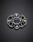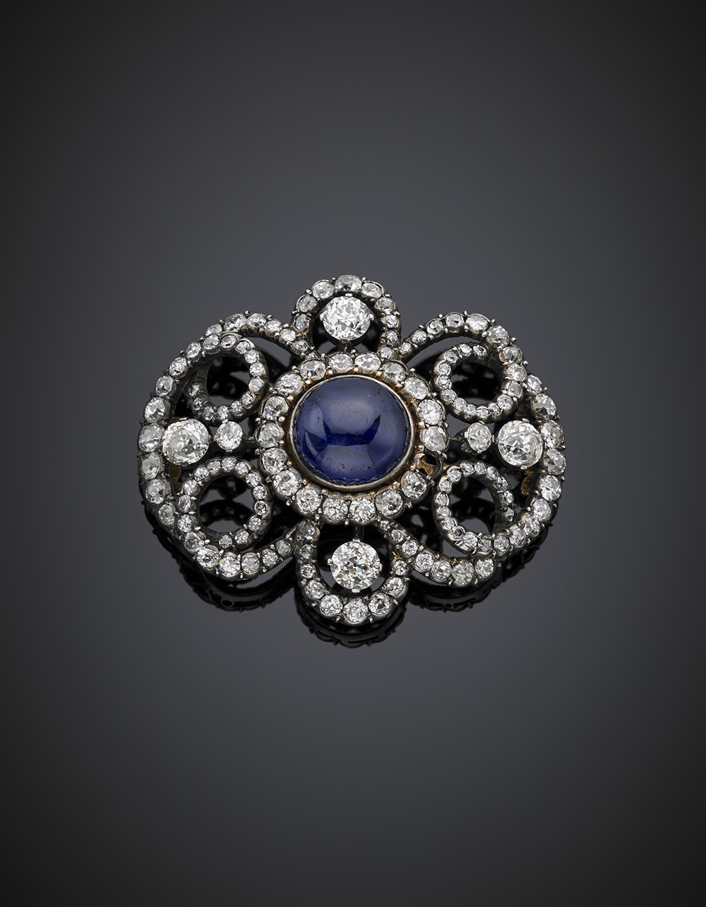 Broche trasformabile in bracciale in oro, argento, diamanti e zaffiro cabochon rotondo di ct. 10 circa, complessivi g 26,47, largh. cm 5,50, h cm 3,90, diam. cm 5,80 circa. Accompagnato da stima di Bucherer n.675217