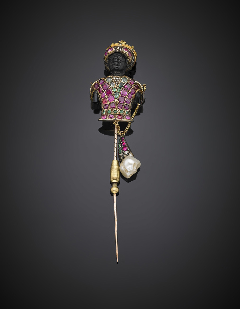 Spillone a guisa di moretto in oro giallo, ebano, rubini, smeraldi, diamanti irregolari e perla, dettagli in onice, g 16,81, lungh. cm 10 circa. In scatola originale