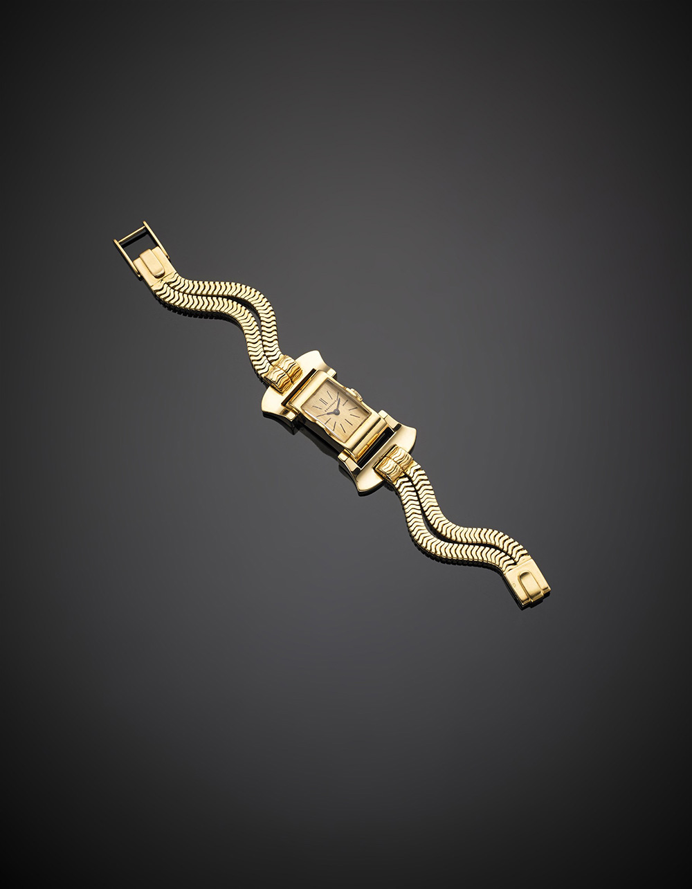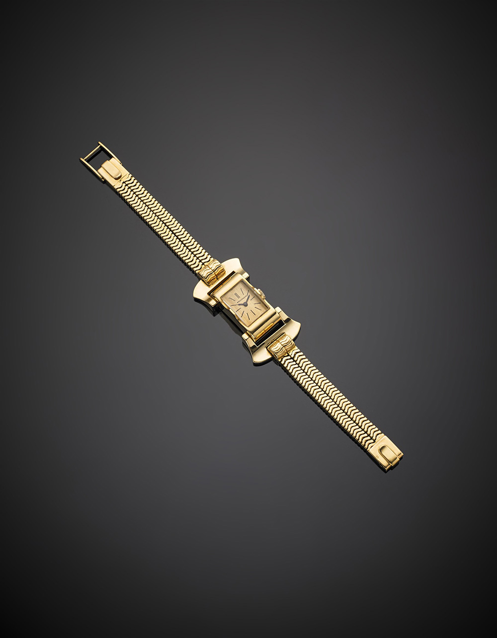 Orologio da polso da donna in oro giallo con bracciale a tubo-gas integrato, g 57,7, lungh. cm 17,50 circa. Marchi francesi e firmato Boucheron Paris.