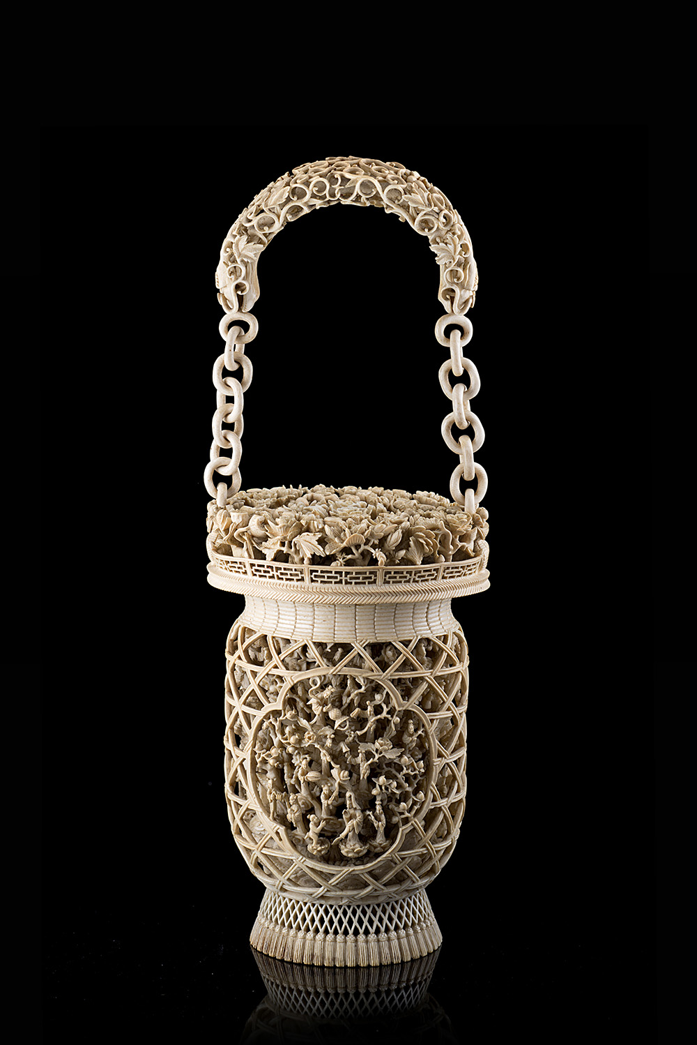 A carved and pierced ivory basket with handle decorated with floral and geometric motifs