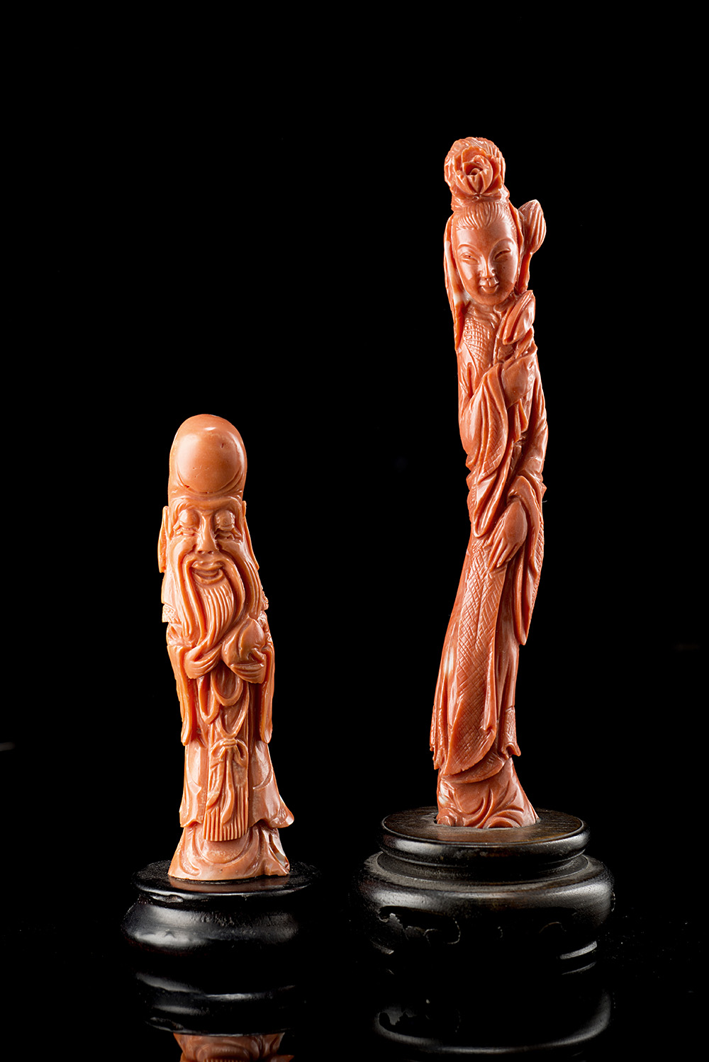 Due sculture in corallo raffiguranti Shoulao e una dama dalle lunghe vesti, base in legno