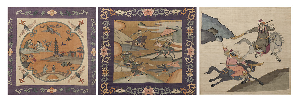 Tre pannelli in seta ad arazzo, Kesi, montati in cornice